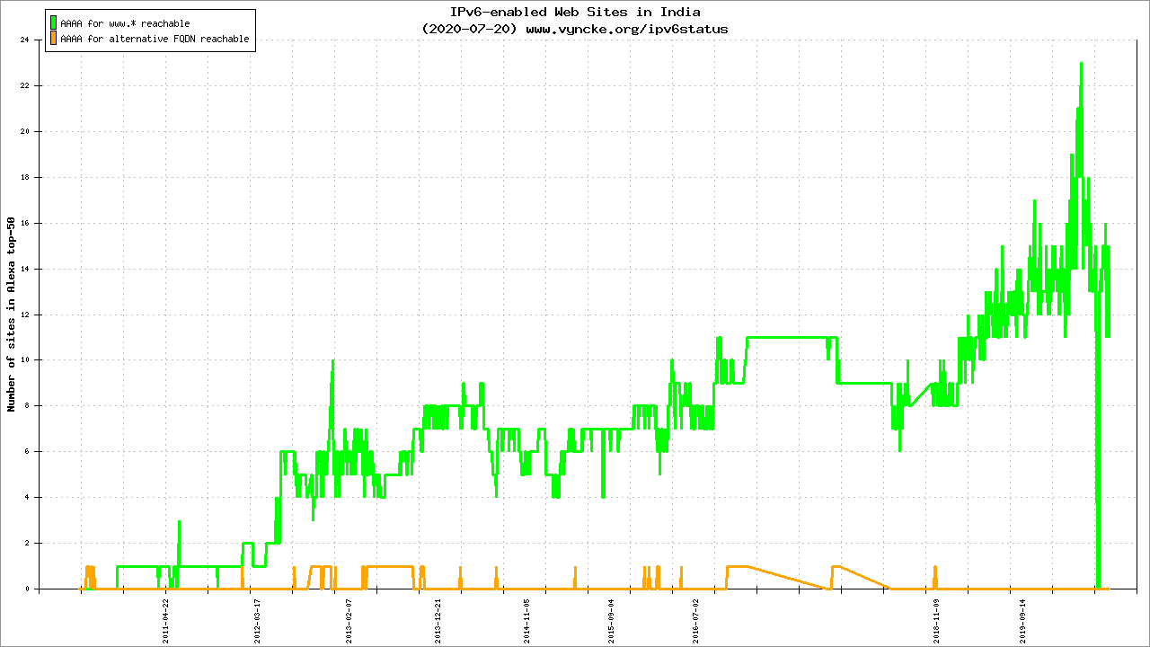 圖6 印度TOP 50網(wǎng)站IPv6支持?jǐn)?shù)量趨勢