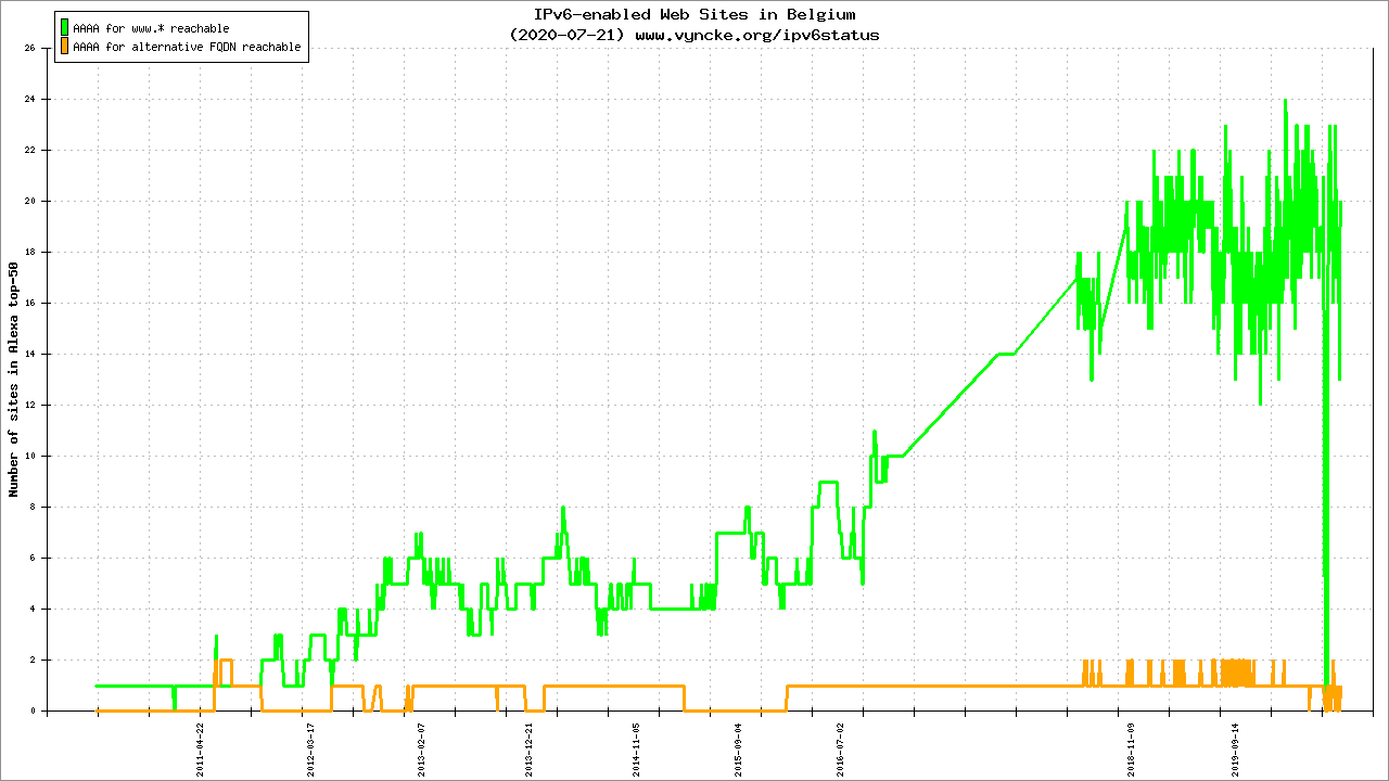 比利時在2012年底之前支持IPv6的網(wǎng)站數(shù)量保持在4個以下,2012年底開始到2016年中期網(wǎng)站數(shù)量保持在了6個左右。2016年7月開始支持IPv6的網(wǎng)站數(shù)量有了明顯上升,從2018年5月開始,網(wǎng)站數(shù)量穩(wěn)定保持18個左右,最高時達(dá)到了24個(圖3)。