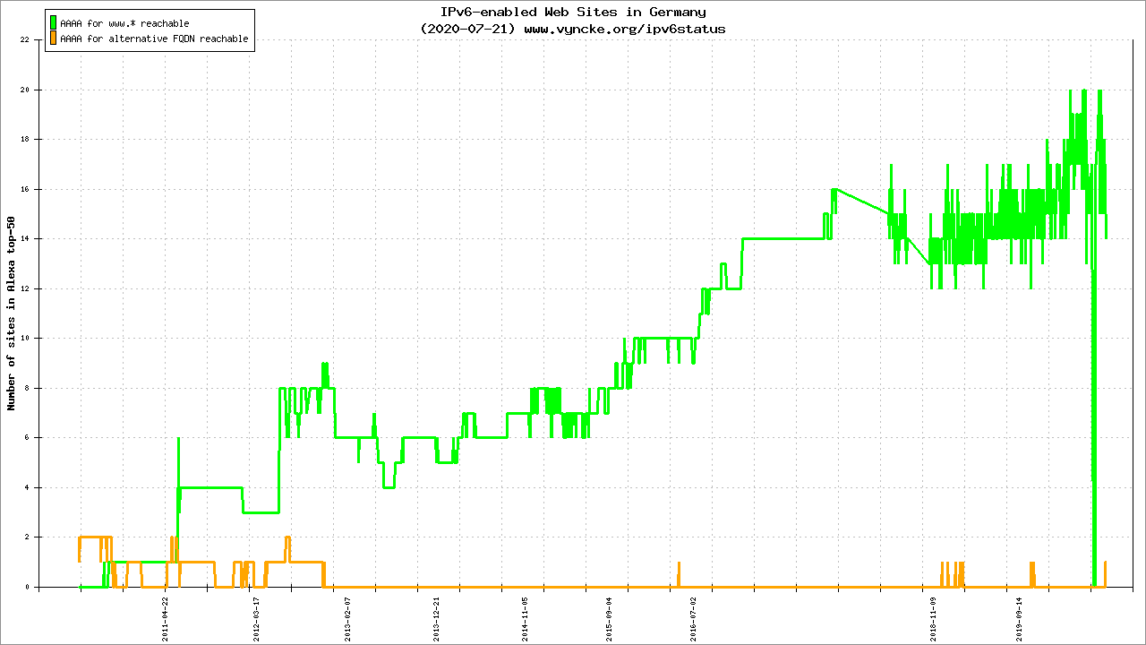 德國從2012年中期到2015年底支持IPv6的網(wǎng)站數(shù)量一直在10個以下。從2016年7月開始有了明顯的上升,至今維持在了16個左右,最高時達(dá)到了20個(圖4)。