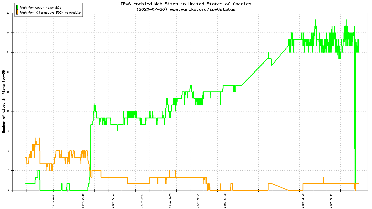 美國從2012年中期開始支持IPv6的網(wǎng)站數(shù)量從0升至10個,并在兩年內(nèi)一直保持在9-12個,之后在14年底到16年底的時間內(nèi)穩(wěn)定保持在了12-15個,從18年中期開始支持IPv6的網(wǎng)站數(shù)量上升至20+,并一直穩(wěn)定在21-24個上下,最高時期達(dá)到了26個(圖8)。