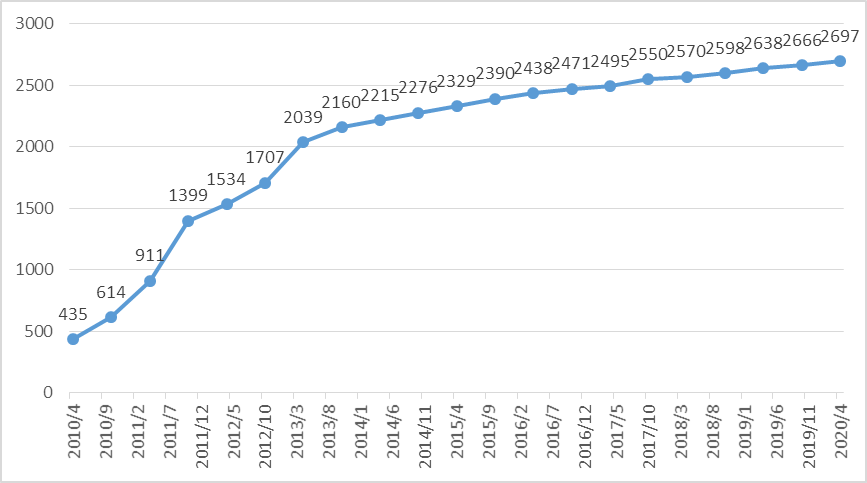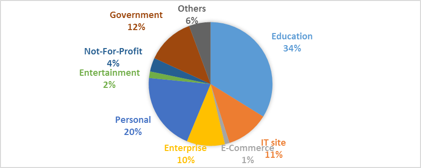 據(jù)全球IPv6論壇IPv6 Enabled WWW Logo認(rèn)證項目統(tǒng)計,截止到2020年6月,全球已有2697個網(wǎng)站通過IPv6 Enabled WWW Logo測試并獲得認(rèn)證。以下是IPv6 Enabled WWW Logo項目提供的累年總體統(tǒng)計數(shù)據(jù),如圖9。IPv6 Enabled認(rèn)證的網(wǎng)站按國家/地區(qū)分布統(tǒng)計如圖10,IPv6 Enabled Logo按網(wǎng)站類型統(tǒng)計如圖11。