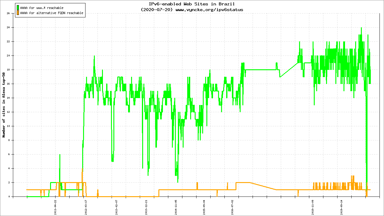 巴西支持IPv6的網(wǎng)站數(shù)量從2012年到2016年平均保持在14個,個別時期會有較大波動,最低時只有2個。2017年開始上升并趨于穩(wěn)定,保持在了20左右,最高時達(dá)到了24個(圖7)。