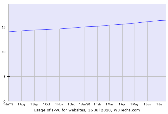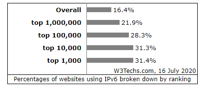 根據(jù)W3Techs的數(shù)據(jù)顯示,截止到2020年7月16日,全球所有網(wǎng)站中有16.4%的網(wǎng)站支持IPv6訪問,比去年提高了1.8%。排名前100萬的網(wǎng)站中有21.9%的網(wǎng)站支持IPv6訪問,比去年提高了2.7%。排名前10000的網(wǎng)站IPv6支持率31.3%,比去年提高了3.6%(圖1~圖2)。