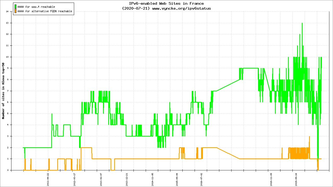 法國方面,從2011年開始至今,Top50的網(wǎng)站中支持IPv6網(wǎng)站數(shù)量幾乎沒有超過10過,大部分時期都是在10個以下,平均保持在6個左右,最高時達(dá)到了13個(圖5)。