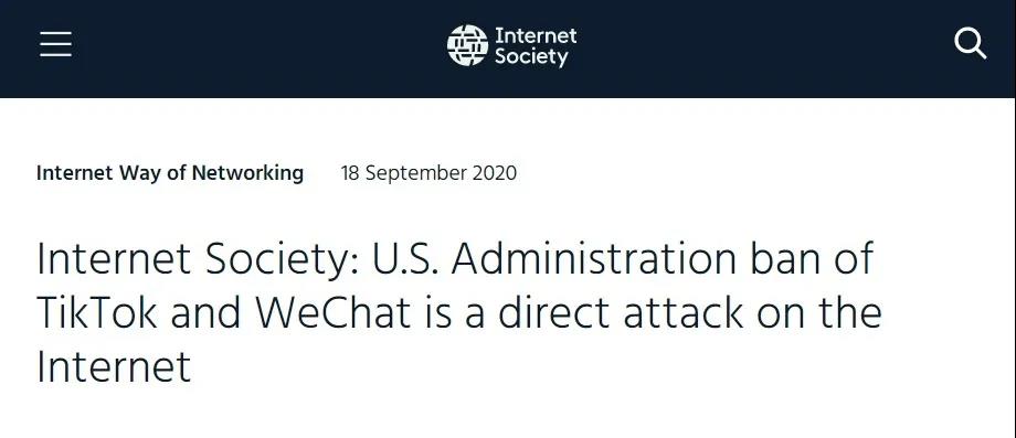 9月18日,針對日前美國政府對TikTok(抖音海外版)和微信的禁令,國際互聯網學會(Internet Society)發(fā)表聲明表示,美國政府對TikTok和微信的禁令是對互聯網的直接攻擊。